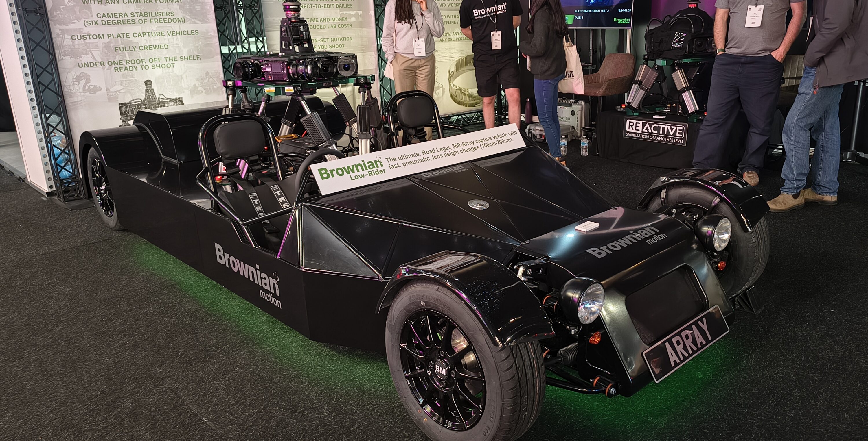 The set-up which Driving Plates have on display here is really interesting, so Ian to elaborate a bit on it. ”So right now we have partnered with a company called Mo-Sys, and they’ve developed a system that puts compressed air bellows underneath the car to simulate the bumps in the road, which is one of the things that hampers virtual production in convincing the audience, and in addition to that they have an attachment to the steering wheel which turns the wheel on the corners, so the actors don’t have to remember to turn the corner. The wheel will go around of itself.”